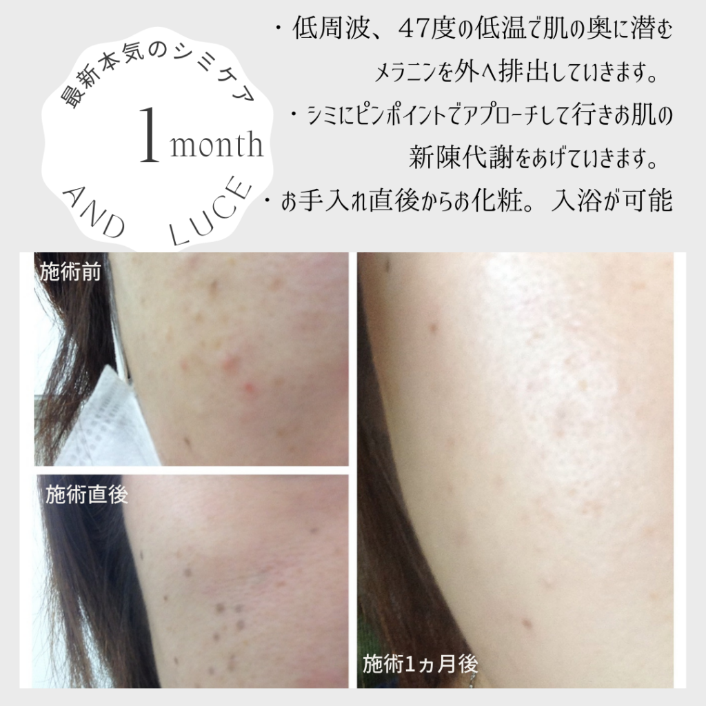 さらに、シミケア前にフォトフェイシャルや角質ケア、美容液導入などのケアをプラスしながら、よりお肌を活性化するメニューを組み合わせることで、メラニンを排出しやすい代謝のよいお肌になり、ぐっとターンオーバーを促進させていきます☆